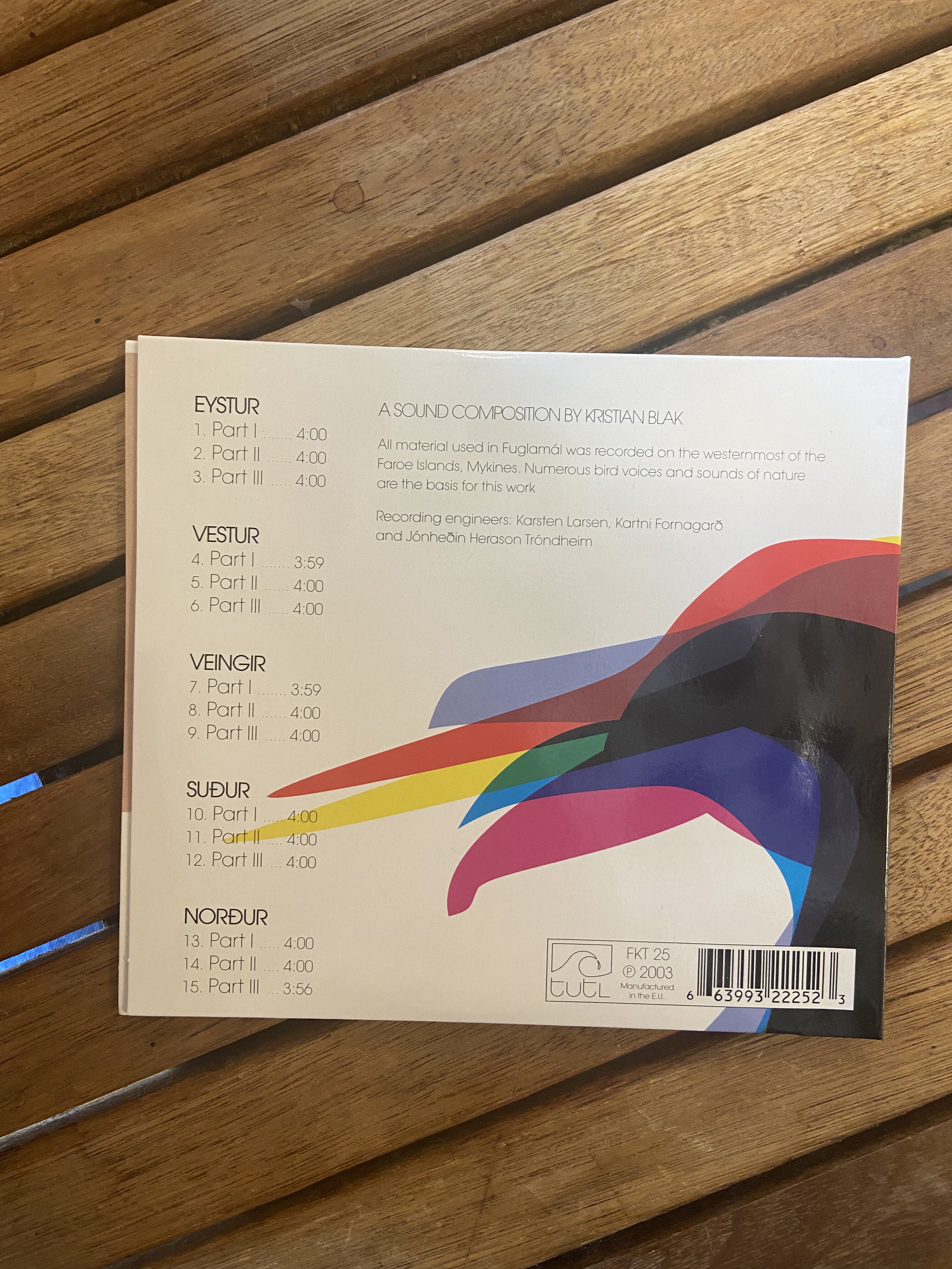 All material used in Fuglamál was recorded on the westernmost of the Faroe Islands, Mykines. Numerous bird voices and sounds of nature are the basis for this work.