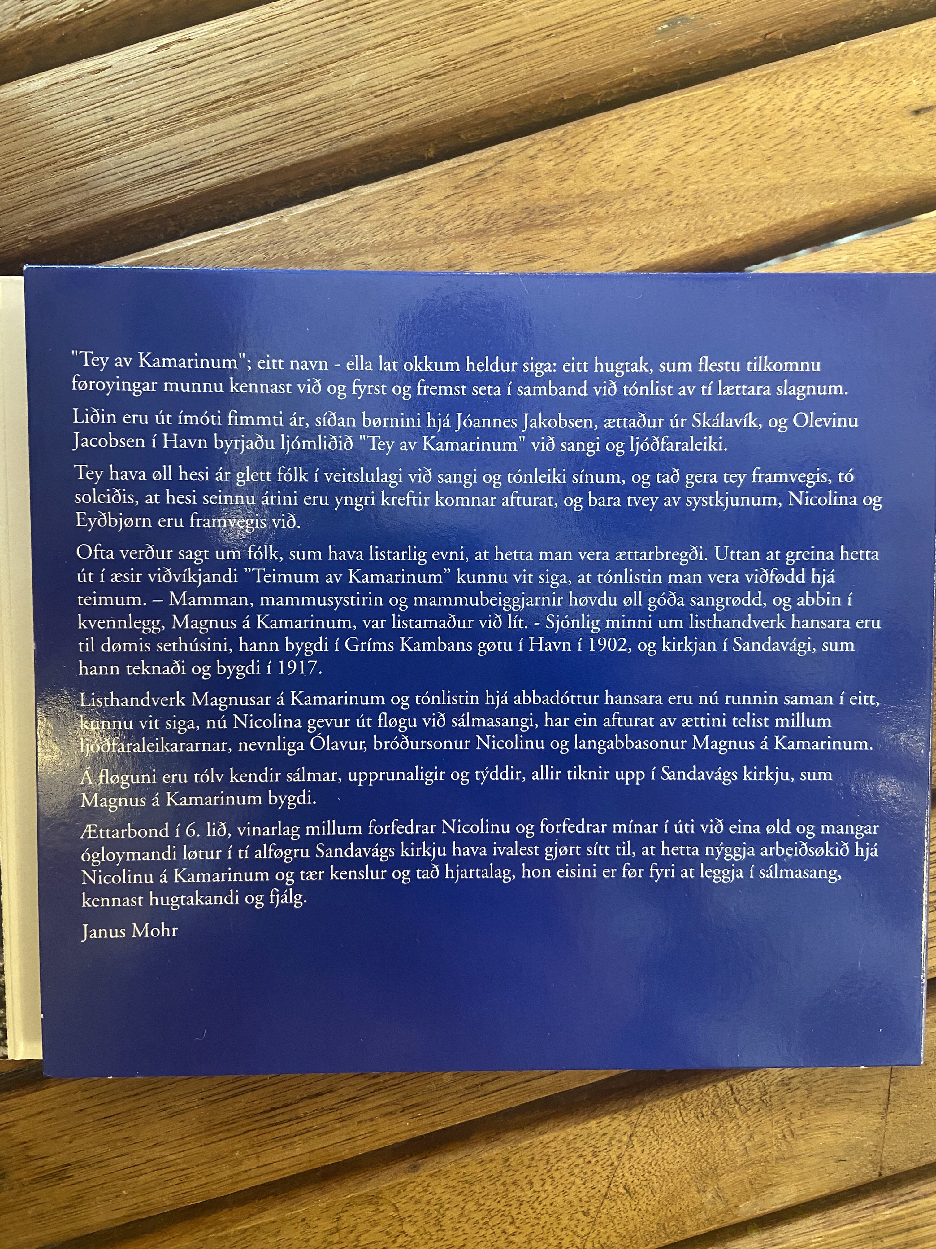 Ættarbond í 6. lið, vinarlag millum forfedrar Nicolinu og forfedrar mínar í úti við eina øld og mangar ógloymandi løtur í tí alføgru Sandavágs kirkju hava ivalest gjørt sítt til, at hetta nýggja arbeiðsøkið hjá Nicolinu á Kamarinum og tær kenslur og tað hjartalag, hon eisini er før fyri at leggja í sálmasang, kennast hugtakandi og fjálg.